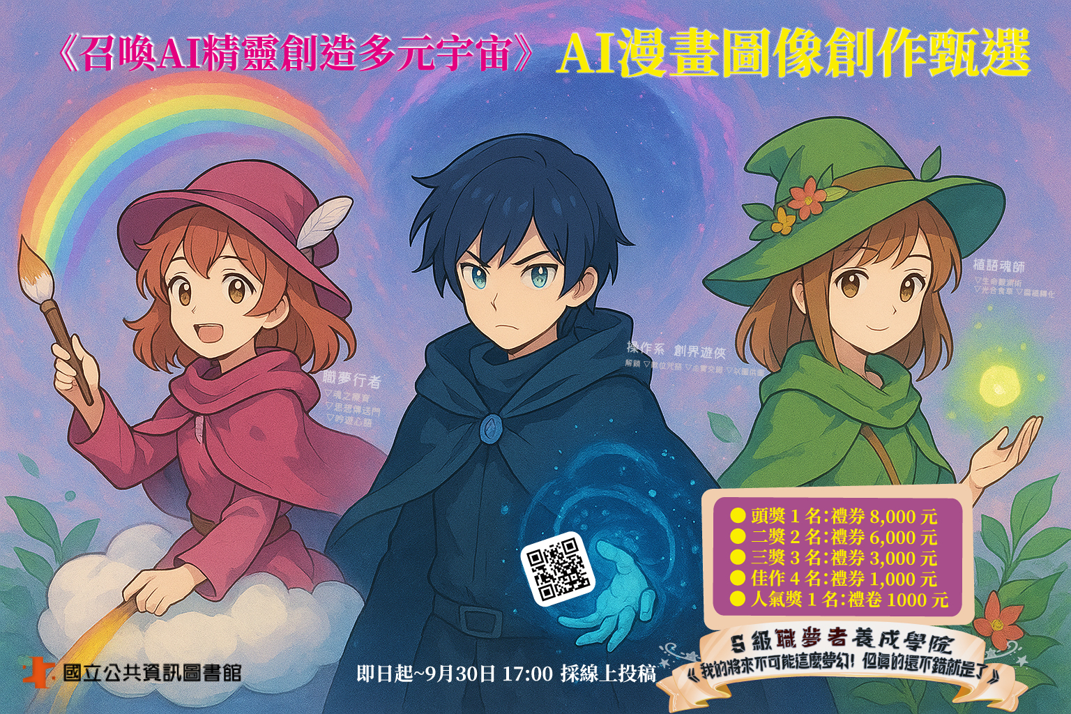 轉知國立公共資訊圖書館辦理「召喚AI精靈創造多元宇宙──AI漫畫圖像創作甄選」活動一案。