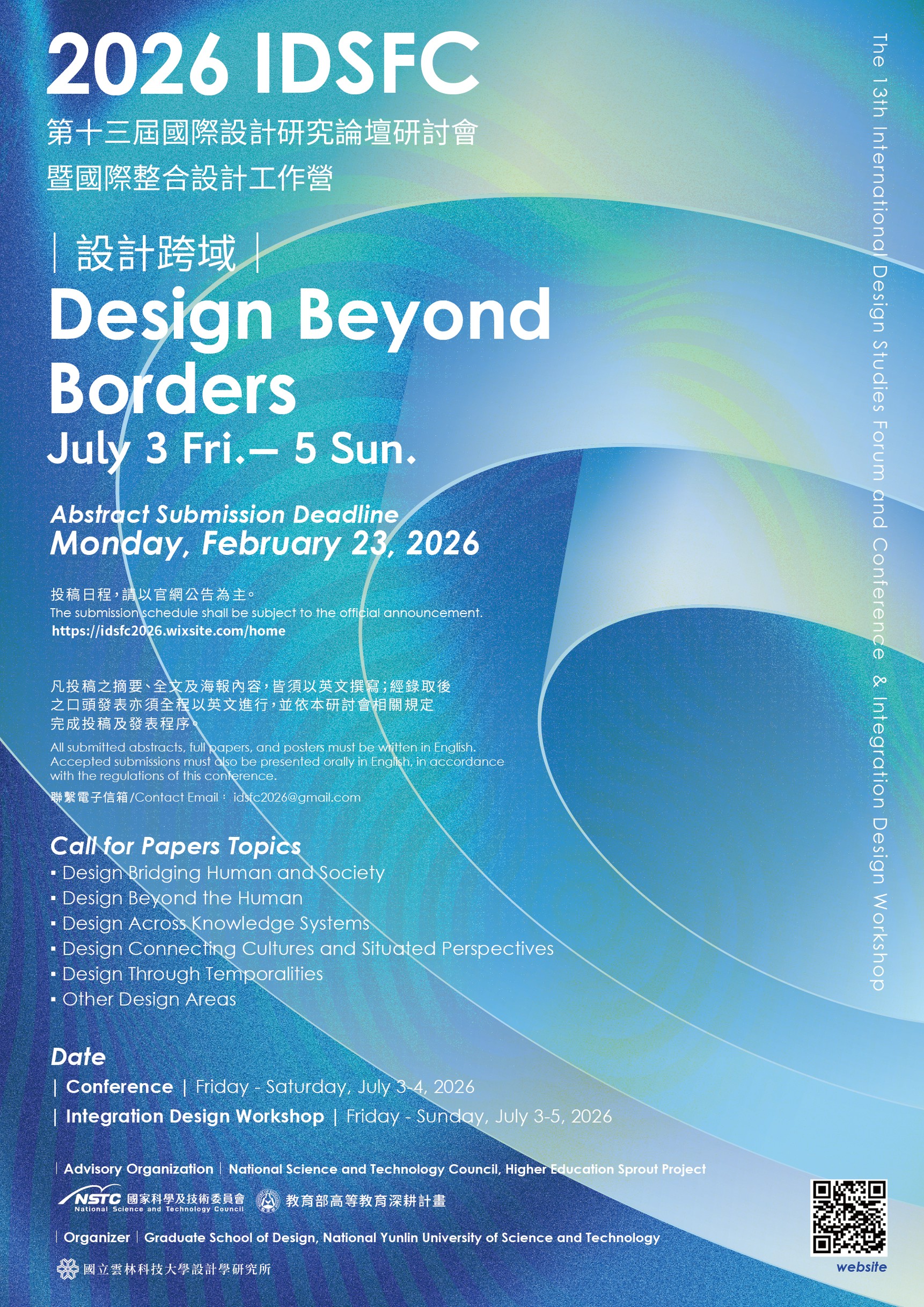 一、「2026 第十三屆國際設計研究論壇研討會暨國際整合設計工作營」訂於 2026年7月3日(星期五)至7月5日(星期日) 假本校設計學院舉辦,活動整合國際學術研討會與實作導向設計工作營,以「設計跨域:Design Beyond Borders」為主題,探討設計於跨學科、文化與技術情境中的角色與實踐。